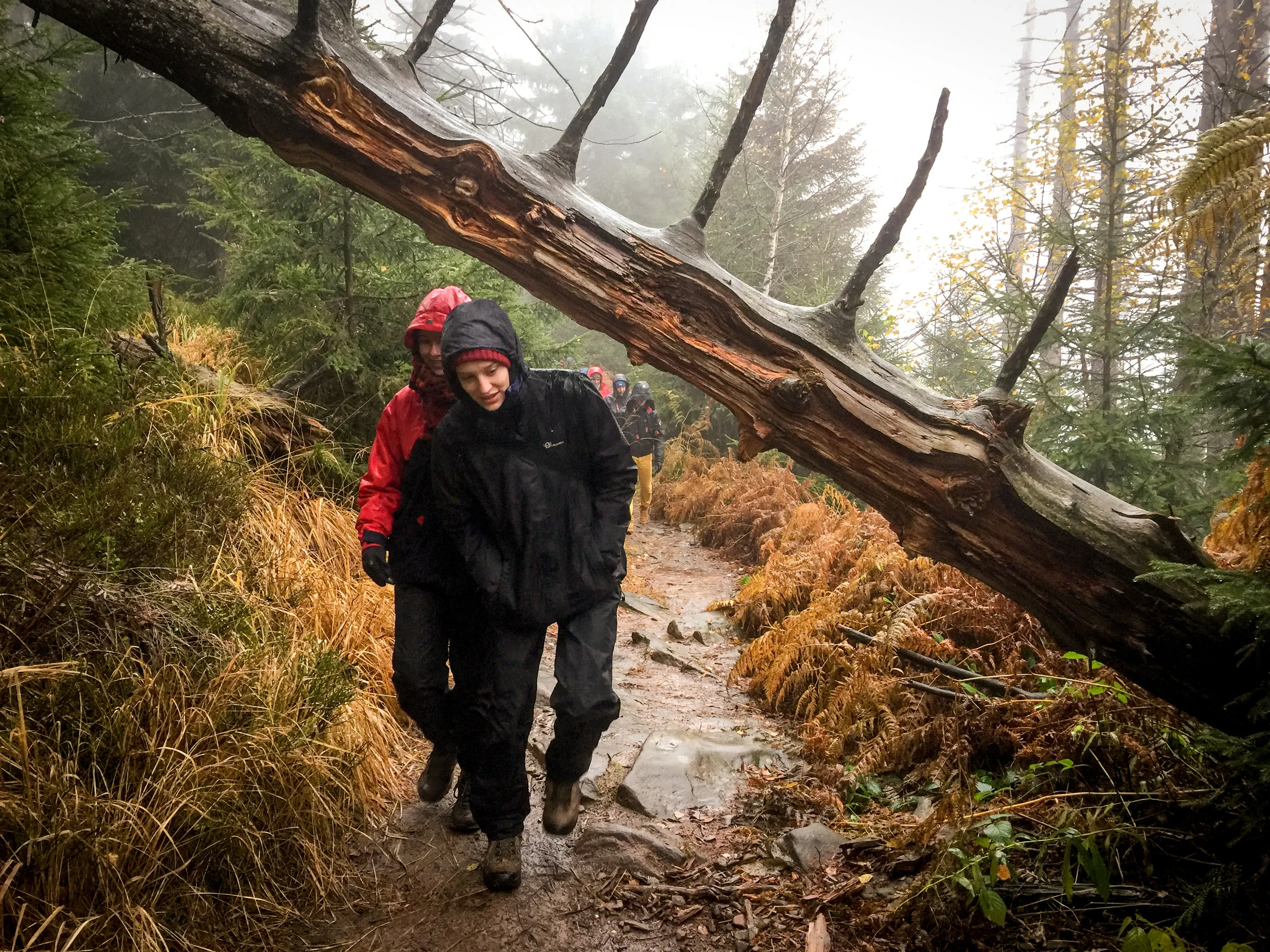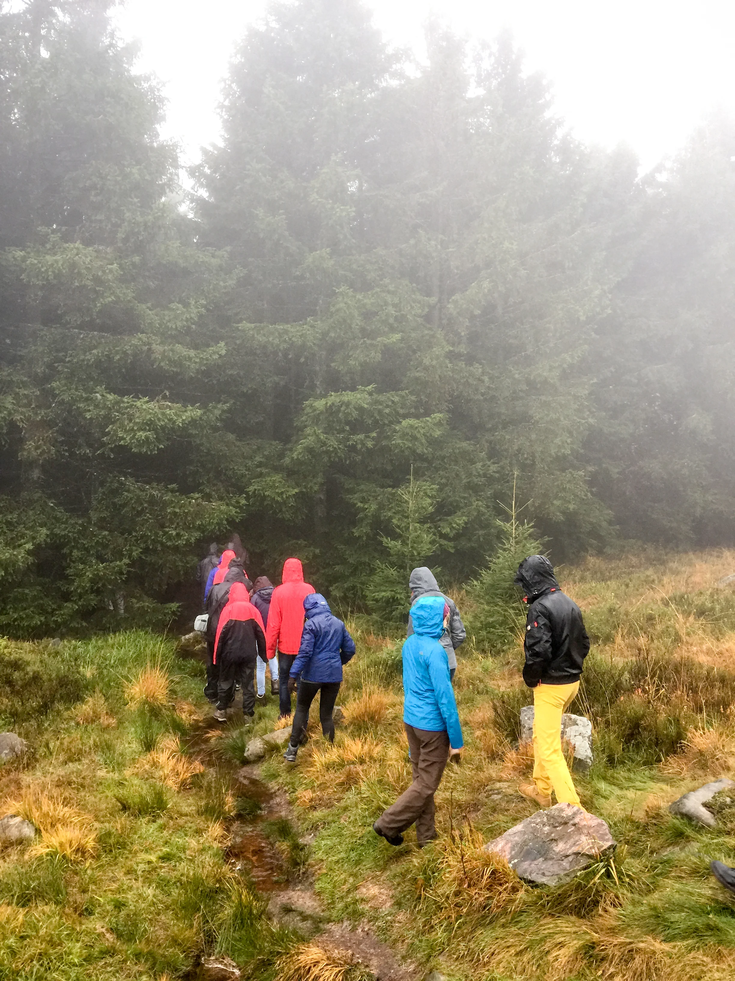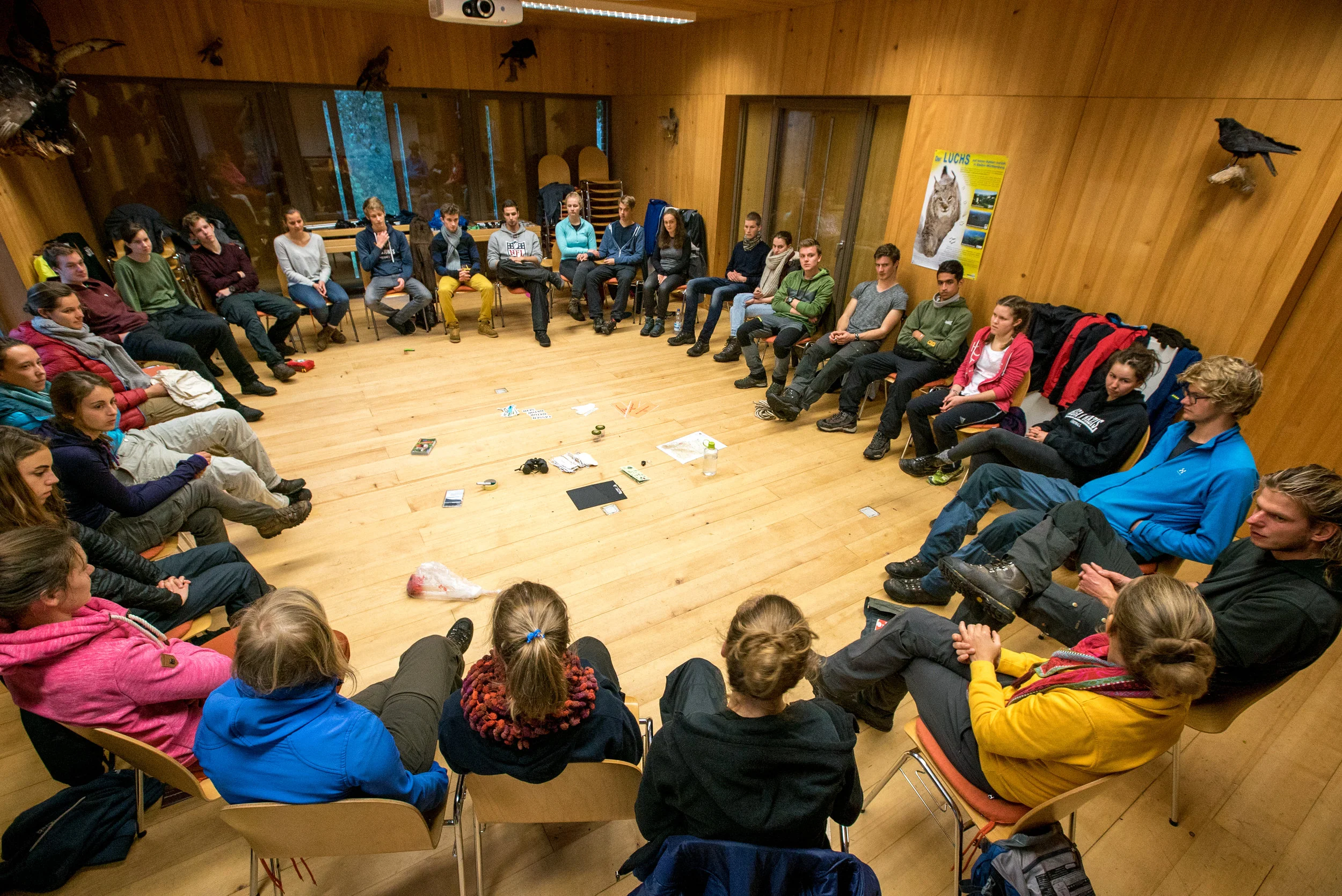 An dieser Stelle machen wir eine Pause. Nach so viel kreativem Denken ist ein bisschen Durchatmen genau das Richtige. Matthias Eberspächer und Marga Bahr, zwei Wildnispädagogen vom Nationalpark, geben mit einem kleinen Vortrag über die Struktur des Nationalparks den richtigen Rahmen dafür. Draußen regnet es derweil in Strömen und es ist gut hier drinnen so gemütlich beieinander zu sitzen. Doch dummerweise sollen wir uns genau diesem Wetter stellen. Ein kleines Mittagessen schindet noch ein bisschen Zeit für uns heraus, aber dann heißt es sich einpacken und ab in die graue Welt da draußen. Aber wir wären keine Young Explorers, wenn uns etwas Regen die Laune verderben würde. Es ist trotzdem sehr schön, durch die verschiedenen Bereiche des Nationalparks zu laufen und das Gelernte im Praktischen zu sehen. Das ständige Platschen und Plätschern der Regentropfen ist unser Begleiter. Teilweise ähnelt der Weg mehr einem Bach als einem Wanderweg. Pitschnass kommen wir schließlich im Nationalparkzentrum an. Dort gibt es noch einen kleinen Exkurs über die Tätigkeiten der Wildnispädagogen rund um das Jahr und die verschiedenen Materialien, die gerade für die Führung einer Besuchergruppe in der Natur wichtig sind. Wirklich schade, da ist man gerade trocken und schon muss man wieder raus in die Nässe. Ziemlich nass und etwas durchgefroren kommen wir wieder auf der Hütte an und es gibt leider keine warme Dusche! Dafür geht es aber weiter mit der Planung der Projekte. Ziel ist es, die Idee so weit zu bearbeiten, dass man sie den anderen konkret vorstellen kann. Die Ergebnisse können sich sehen lassen!