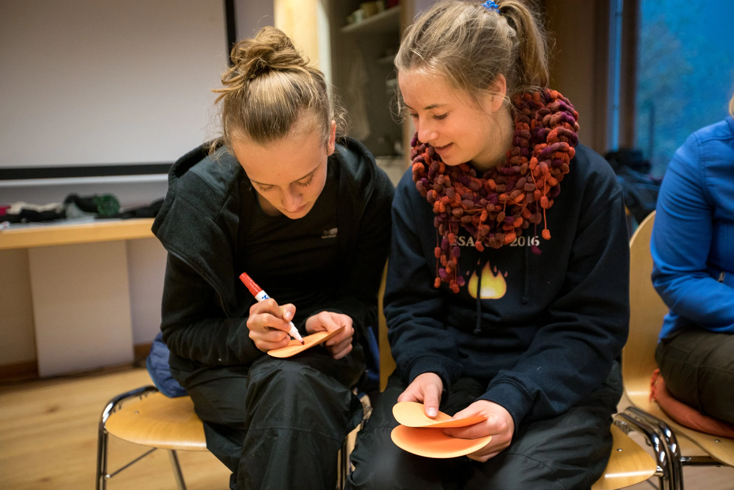 Wenn man den Aufstieg durch die Dunkelheit mit der Stirnlampe wagt, erreicht man die Skihütte auf 1000 Metern. Winzig, aber sehr gemütlich schmiegt sich das kleine Gebäude zwischen die hohen Bäume. Es ist so schön, all diese vertrauten Gesichter wieder zu sehen und zu hören, was die anderen in der Zwischenzeit geschafft und erlebt haben. Um nicht gleich von dieser Fülle erschlagen zu werden, machen wir auf dem Hinweg zur Hütte ein kleines Speeddating. Hierbei kann jeder durch kleine Anregungen ein knappes, aber sehr gutes Gespräch führen. Der erste Abend ist einfach dazu da anzukommen, sich auszutauschen und für einige auch, erst mal vom stressigen Alltagsmodus in die Ruhe der Schwarzwaldnatur einzutauchen. So richtig viel Schlaf bekommt in der ersten Nacht kaum einer. Manche sitzen noch lange beieinander und führen gute Gespräche bis spät in die Nacht.