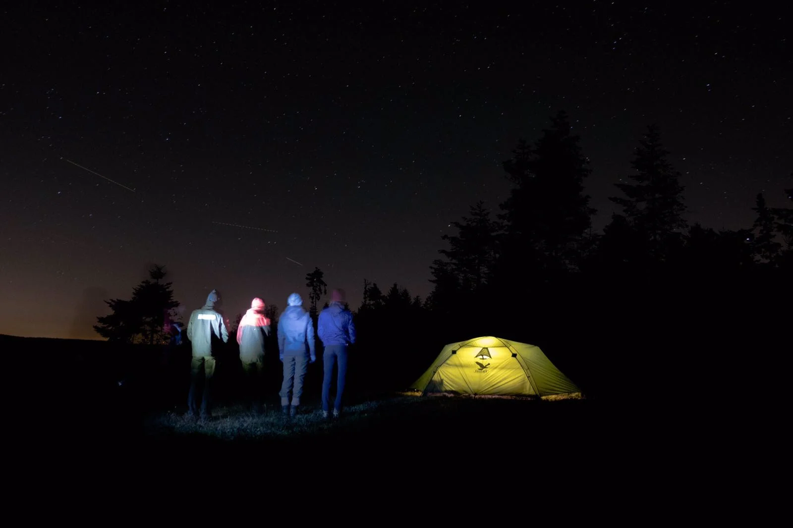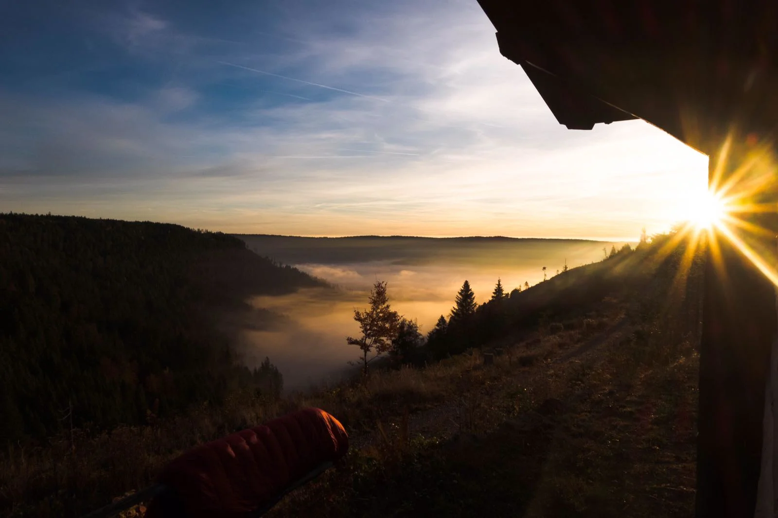 Die warme Sonne trocknete unser Zelt und wärmte uns beim Frühstück. Es hätte nicht besser sein können. Selbst ein vorbeifahrender Förster winkte uns fröhlich, als wir, von ihm überrascht, schnell unsere Isomatte mit leckerem Brot, Aufstrich, Marmelade, Obst und Gemüse aus dem Weg räumen mussten. Recht spät machten wir uns auf den weiteren Weg. In Baiersbronn deckten wir uns mit neuem Brot, Schokolade und Aufstrich ein. Bei schönstem blauem Himmel gönnten wir uns oberhalb von Baiersbronn eine wohlverdiente Mittagspause und machten auf der Karte unseren Schlafplatz für die Nacht ausfindig. Er sollte unbedingt wieder so hoch und in Richtung des Sonnenaufgangs ausgerichtet sein. Abends gelangten wir dann an die Johanna-Katz Hütte, die unsere Vorstellung sogar noch übertraf. Nach dem Essen war es Zeit für eine Runde Sternfotografie. Dabei entstanden wunderschöne Bilder. Wir fotografierten, bis es uns zu kalt wurde. Im Zelt eine Runde Karten, dann ein Blick auf die Uhr: halb neun, Schlafenszeit. Am nächsten Morgen begrüßte uns ein Anblick, der den ersten noch übertraf.