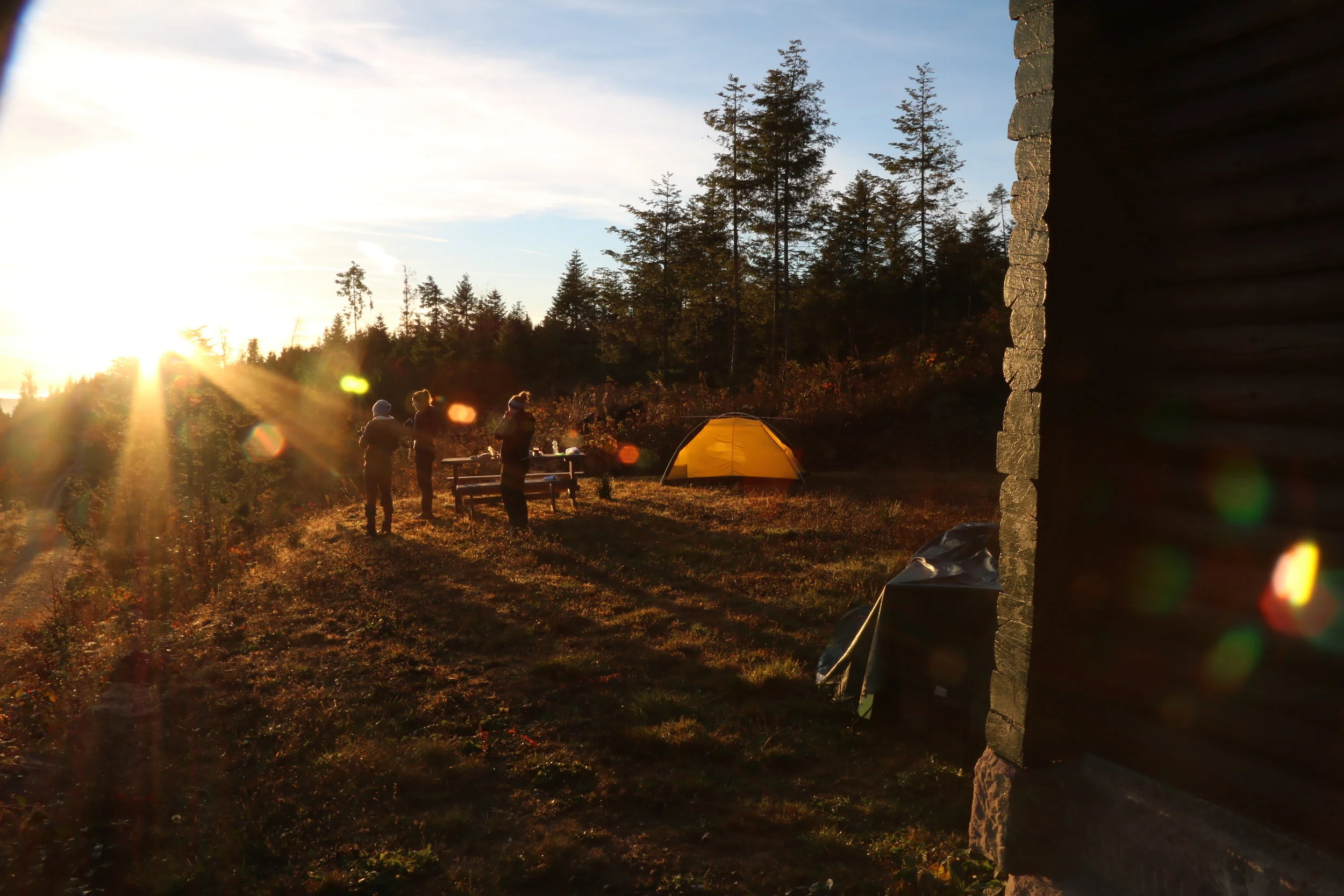 Der nächste Morgen begrüßte uns mit Regen. Trotz der richtigen Ausrüstung machte uns das Wetter zu schaffen. Die zunehmende Kälte und die Nässe von innen und außen, sorgten dafür, dass uns allen ziemlich kalt wurde. Recht früh fanden wir deshalb am Nachmittag einen Platz für die Nacht, wo wir uns mit warmem Essen und Tee stärkten und unsere Laune wieder stieg. Am nächsten Morgen weckten uns von der Zeltdecke fallende Wassertropfen. Hatte es etwa so stark geregnet, dass das Zelt undicht geworden war? Ein Blick aus dem Zelt heraus verschaffte Klarheit. Schon beim Aufziehen des Reißverschlusses splitterte Eis zu allen Seiten weg. Das ganze Außenzelt war gefroren! Beim Loslaufen zeigte das Thermometer der Hütte frische 3°C.