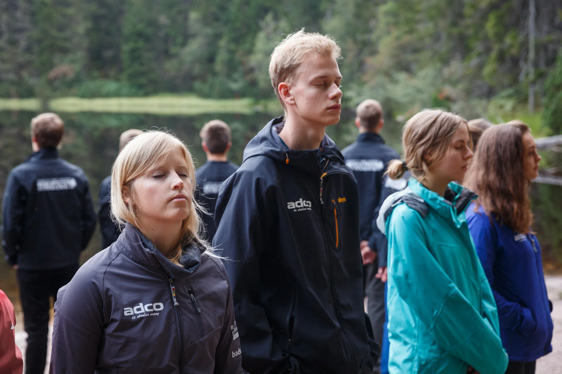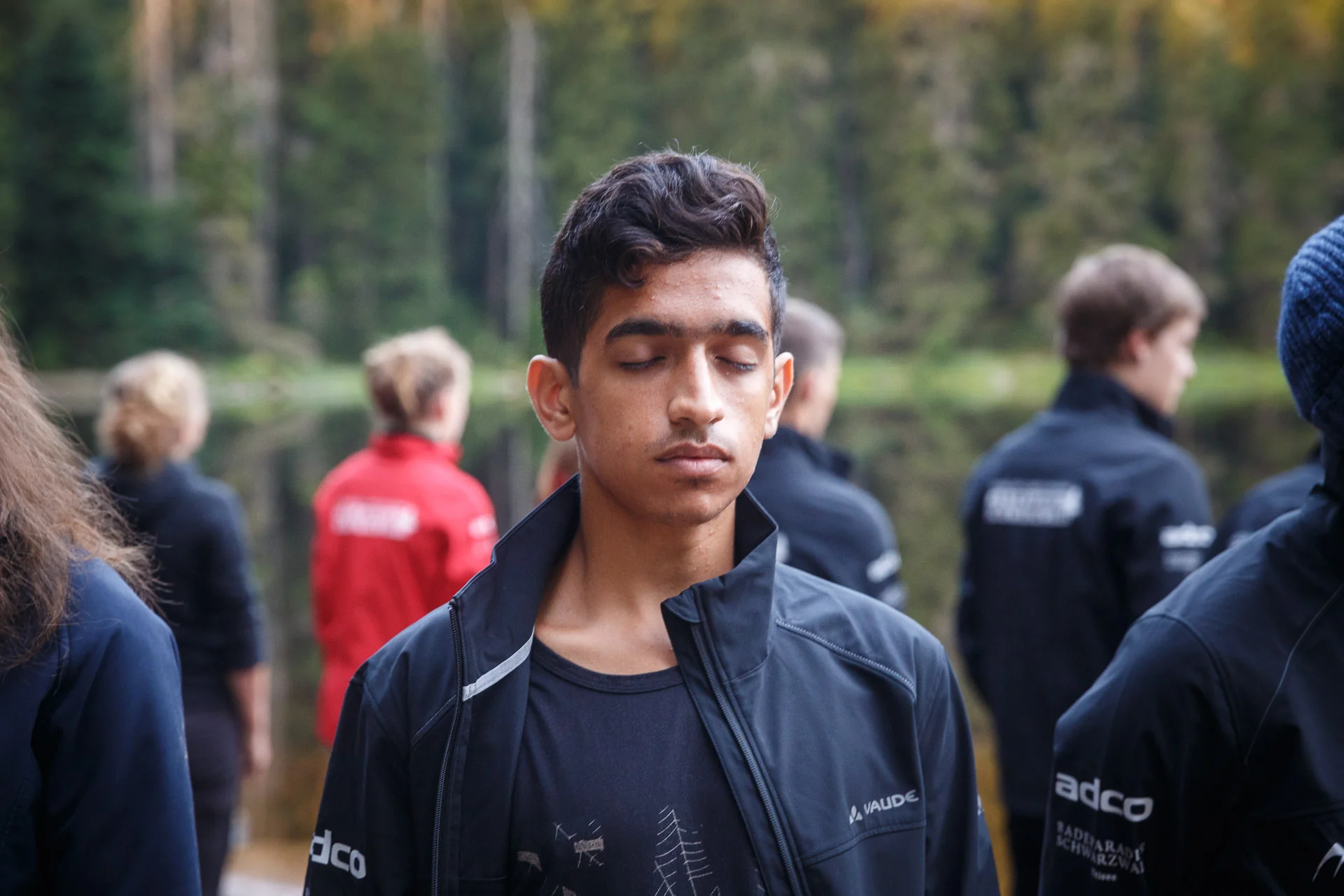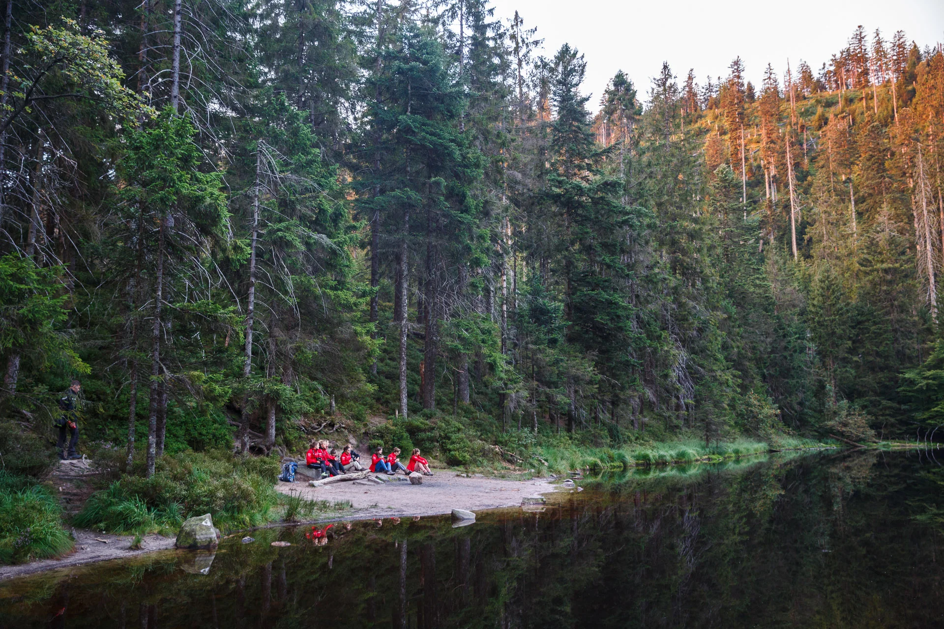 Als wir unten am See ankamen, waren der Wald und der See rötlich erleuchtet. Um am See richtig anzukommen, machten wir eine Übung, bei der man die Natur mit allen Sinnen wahrnehmen sollte. Danach gingen wir mit einem Bild in einem Jutebeutel zu einem Ort am See unserer Wahl, wo wir die Natur um uns herum beobachten sollten. Nach etwa 5 Minuten ertönte ein Kauzruf, unser Signal, dass wir den Jutebeutel öffnen dürfen. Die Überraschung war, dass Spiegel in den Beuteln waren. Durch den Spiegel konnten wir viele neue Perspektiven in unserer Umgebung entdecken. Dann lernten wir alle etwas über den Borkenkäfer und seine Aufgabe im Nationalpark sowie über den Kreislauf der Bäume. Nach dem Aufstieg zur Hütte kam das ersehnte Frühstück. Nach dem leckeren Frühstück haben wir die Themen aus dem gestrigen Workshop weiter bearbeitet, indem wir zu den Hauptthemen “Müll”, “Rebellion der Natur” und “Grenzen” in Gruppen zuerst Fragen und dann Lösungen gefunden haben.