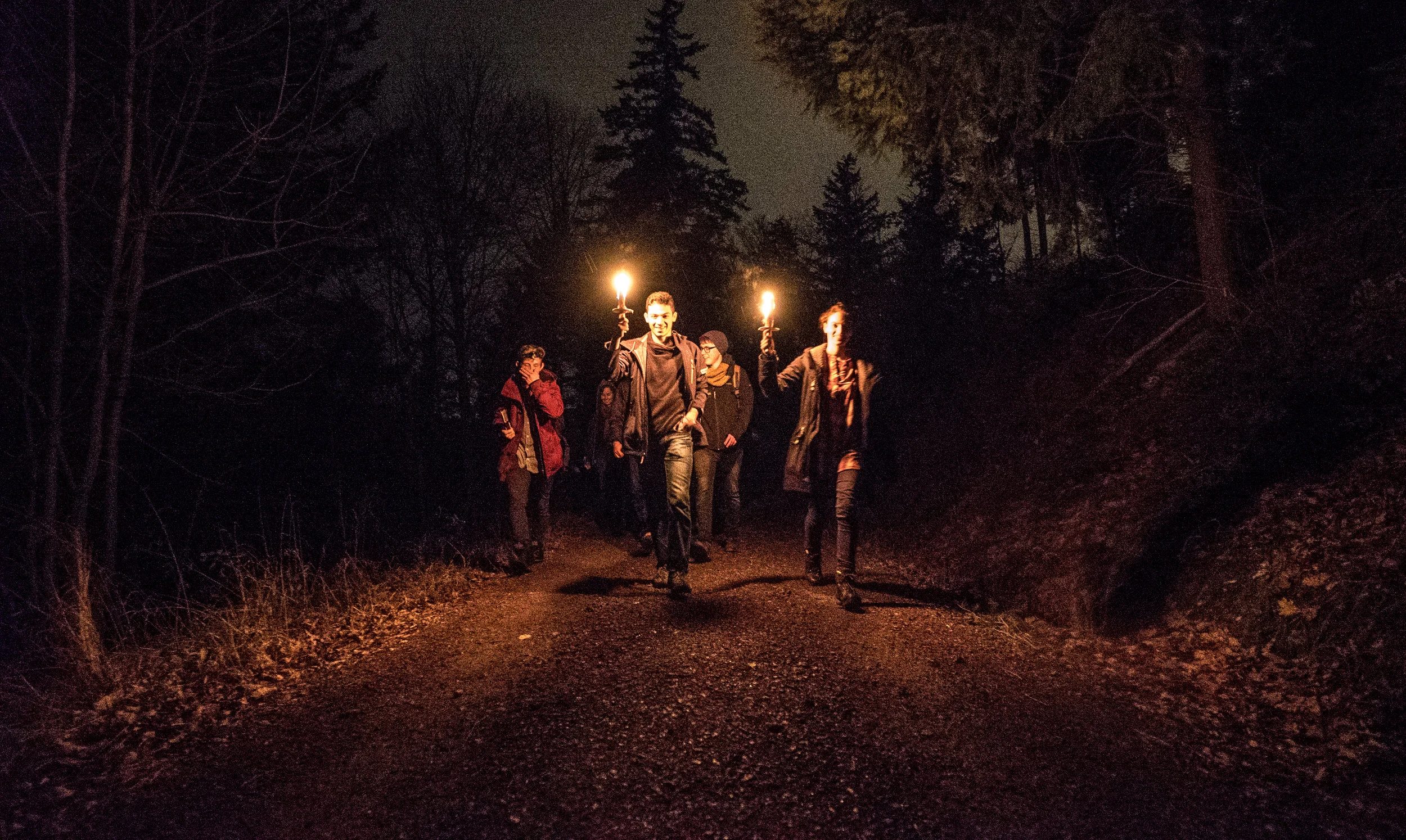 Nach dem Vortrag haben wir uns aufgemacht, durch den Wald nach St. Valentin zu wandern. Sobald keine Straßenlaternen mehr da waren, haben wir unsere Fackeln angezündet und sind trotz Regen einem der vielen Pfade entlang des Günterstals gefolgt, denn "wir sind eine Spur wilder" ;). Während wir unsere Bäuche gefüllt haben, haben wir uns gut amüsiert und viel erzählt. Das Schöne war, dass wir richtig Zeit hatten und so viel Neues über alle erfahren konnten und uns über den Vortrag unterhalten und austauschen konnten. Auch auf dem Rückweg hatten wir viel Zeit zum Reden. Bei unseren anderen Treffen haben wir meist viel Programm, was ziemlich gut ist, aber so war es auch schön!