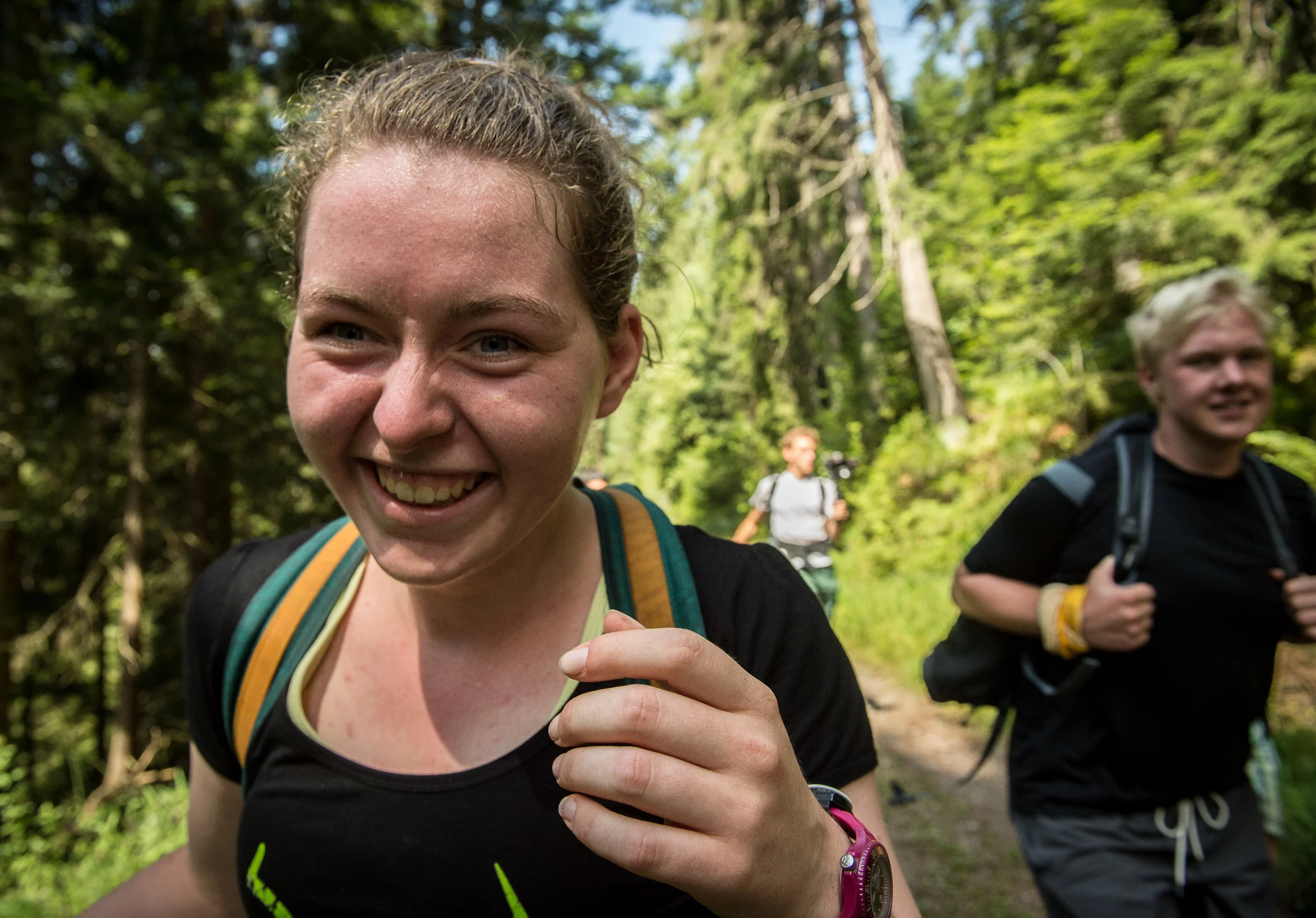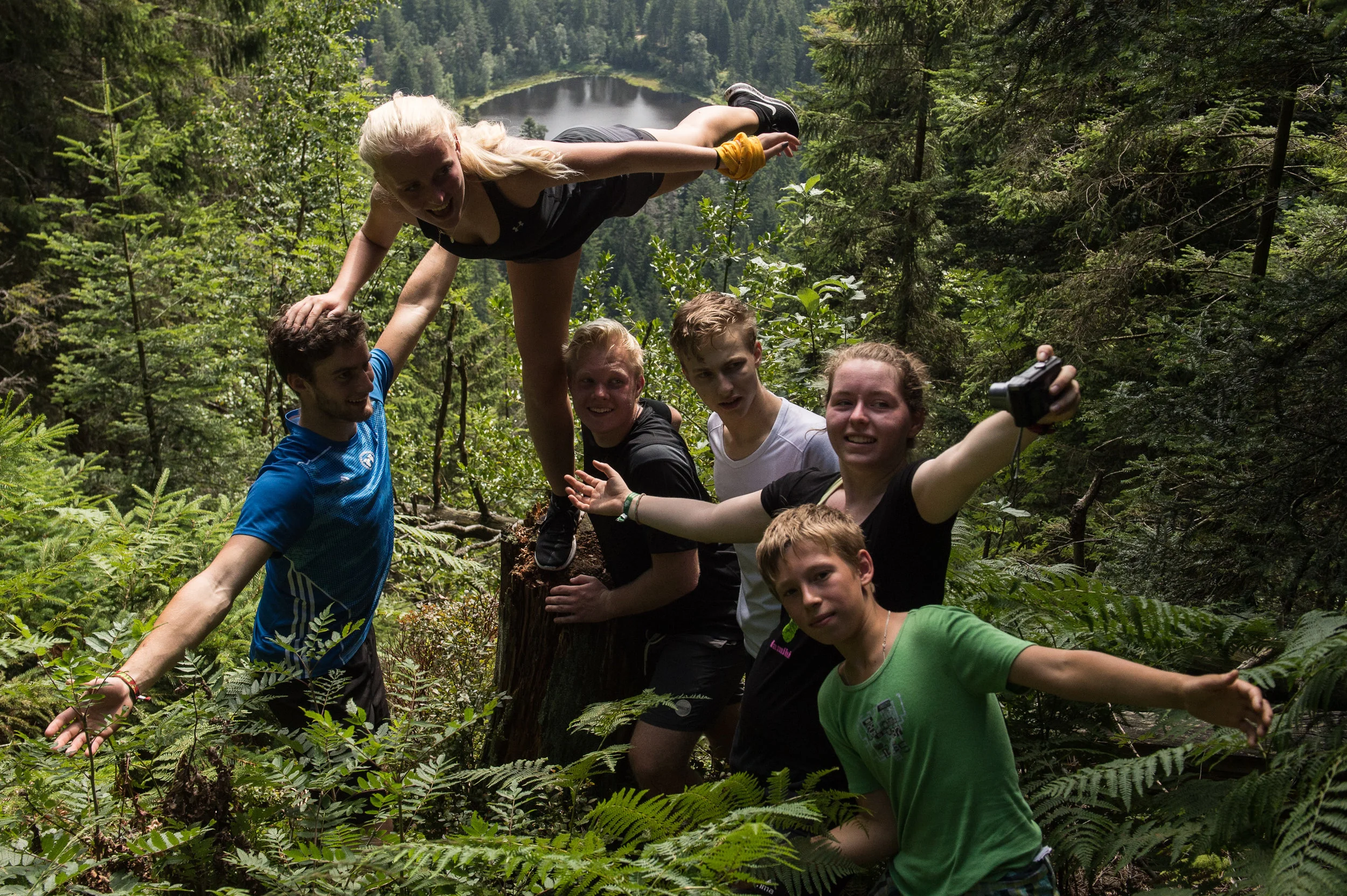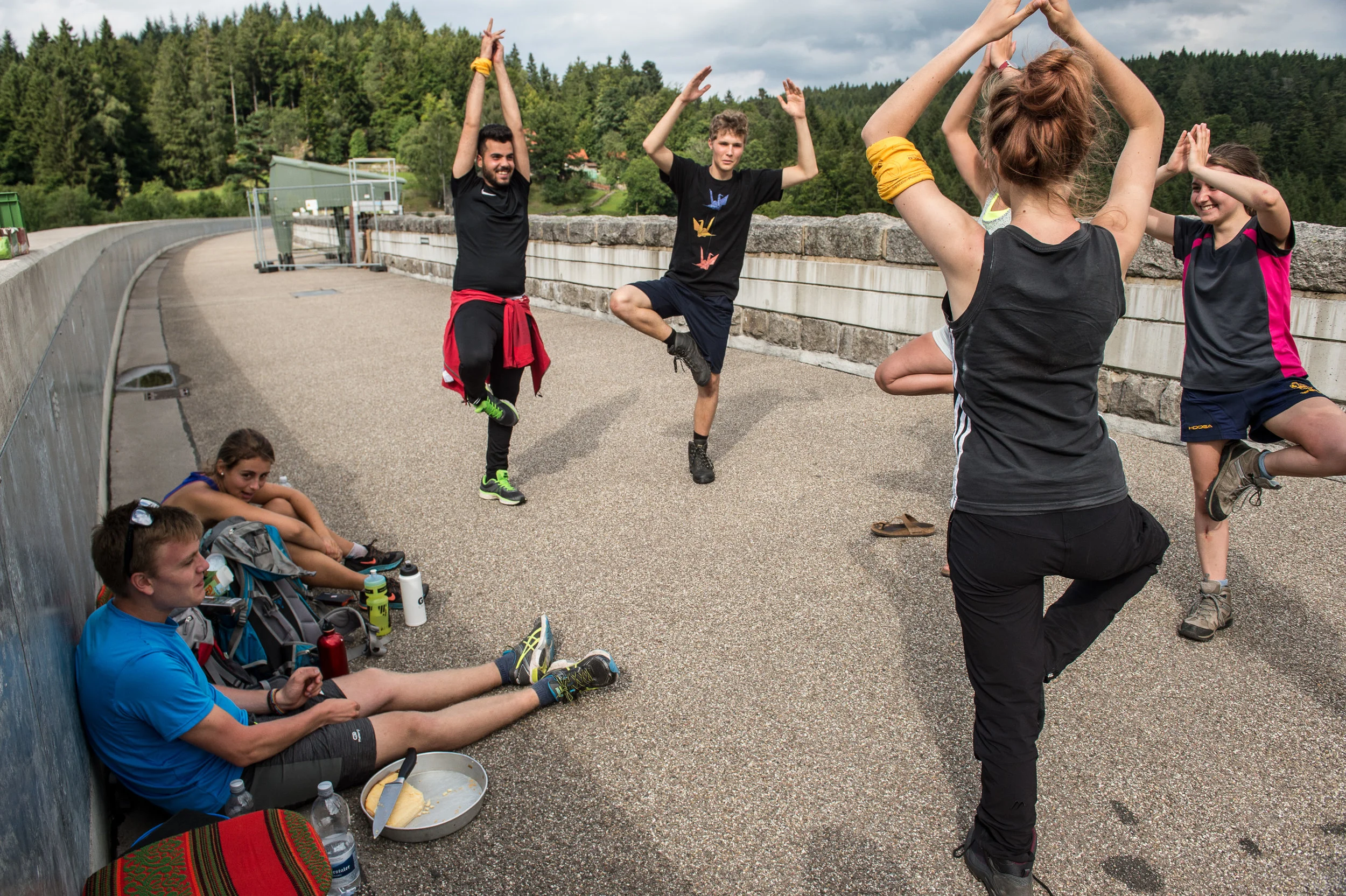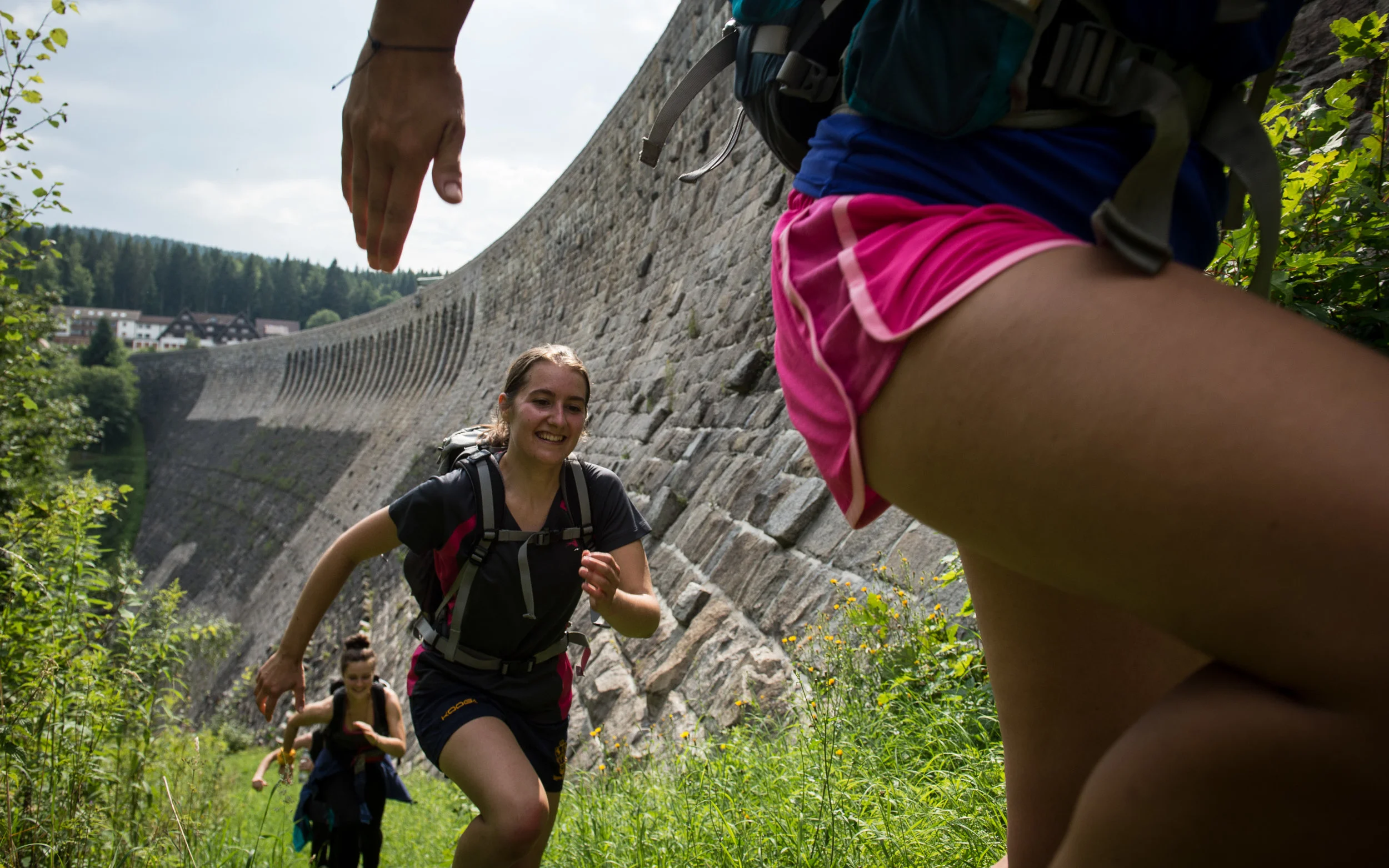 Zuerst mussten wir den Philippenkopf ausfindig machen. Nachdem wir in einem weiteren Rätsel die Nummer des Teufels auf den Kopf gestellt hatten, ging es weiter zum Diebaukopf (auf 999 Höhenmetern). Von dort aus bekamen wir die Challenge mit verbundenen Augen zum Blindsee zu laufen. Vertrauen und Teamarbeit waren dabei unentbehrlich. Das nächste Rätsel führte uns zum Schurmsee. Dort mussten wir vier pantomimische Aufgaben lösen, bevor wir unser nächstes Ziel gesagt bekamen. Auf dem Weg nach Schönmünzach ging es auf einem steilen Weg ins Tal. Dort war der erste Checkpoint. Nach einer kurzen Pause im Park ging es auch schon weiter Richtung Staumauer - Schwarzenbach Talsperre. Nach einer 60-sekündigen Yogaübung auf der Talsperre ging es nach einem Stückchen Schokolade sofort weiter. Team 1 übernahm mit 15 Minuten Vorsprung die Führung, dicht gefolgt von Team 4. Einmal um den Stausee herum und weiter zum Herrenwieser See. Barfüßig liefen wir eine Runde um den See.