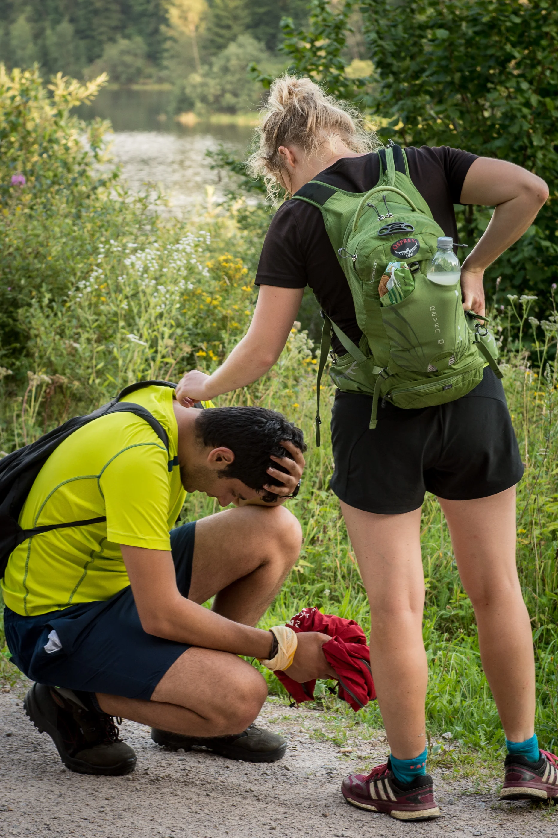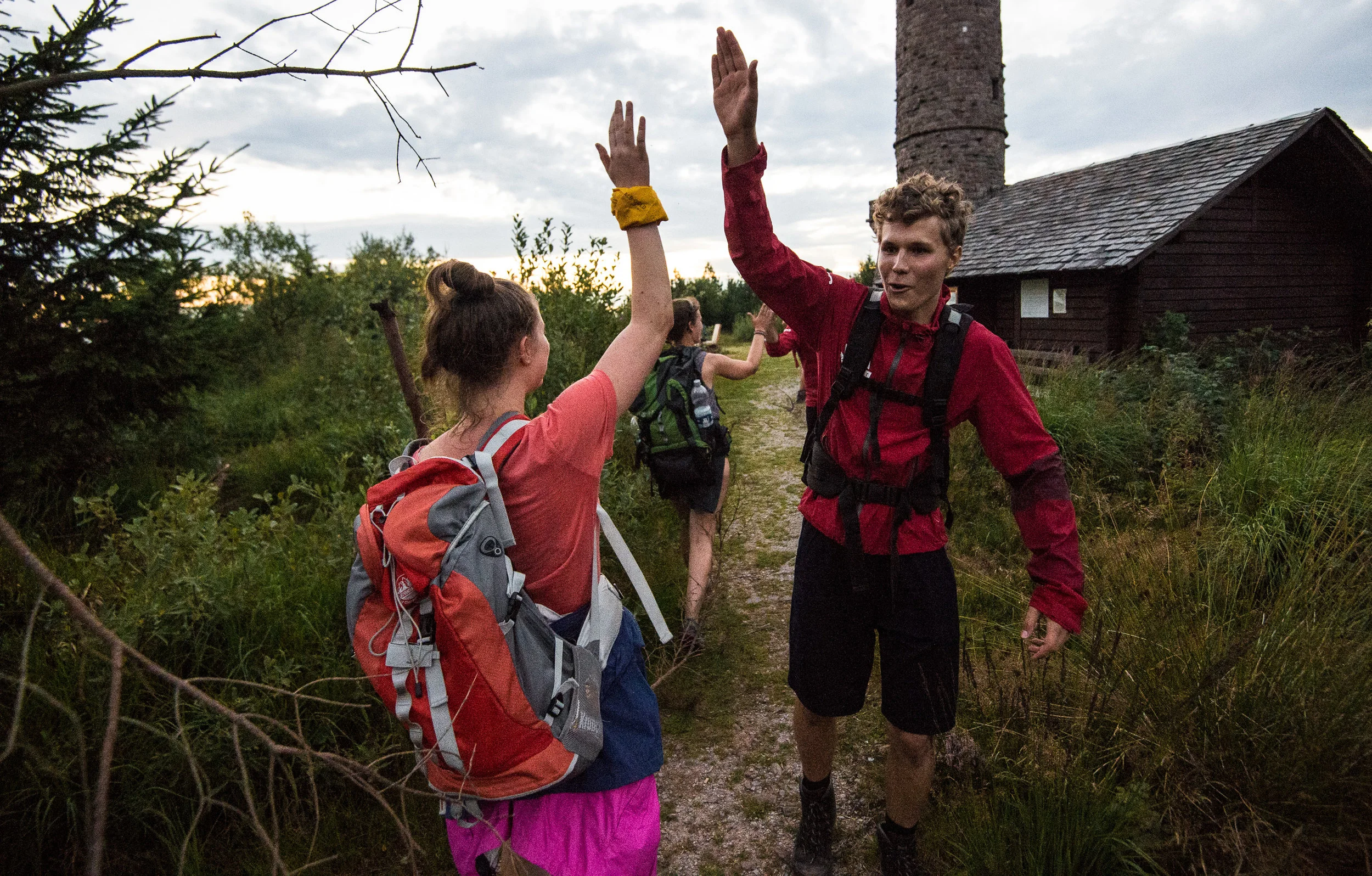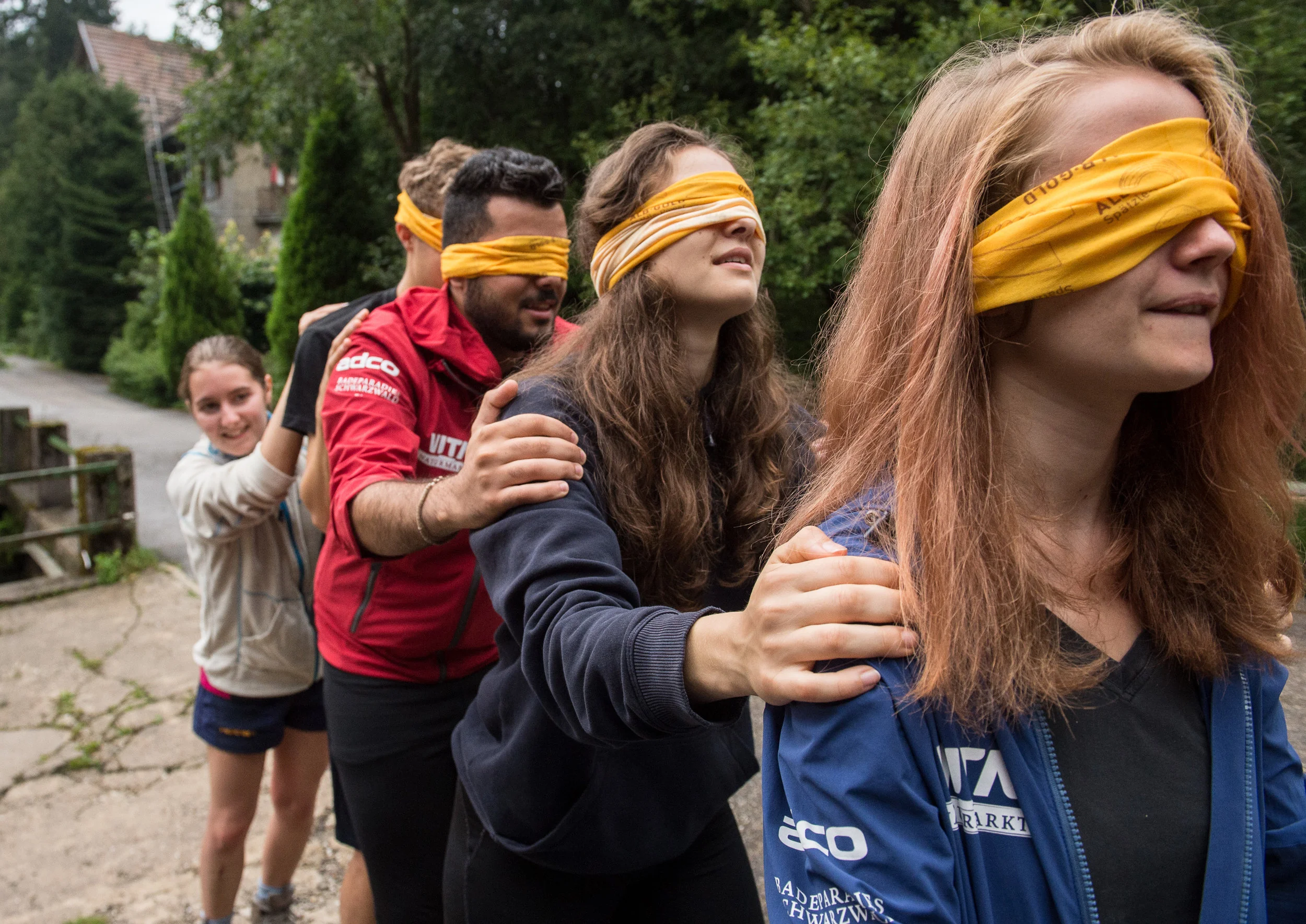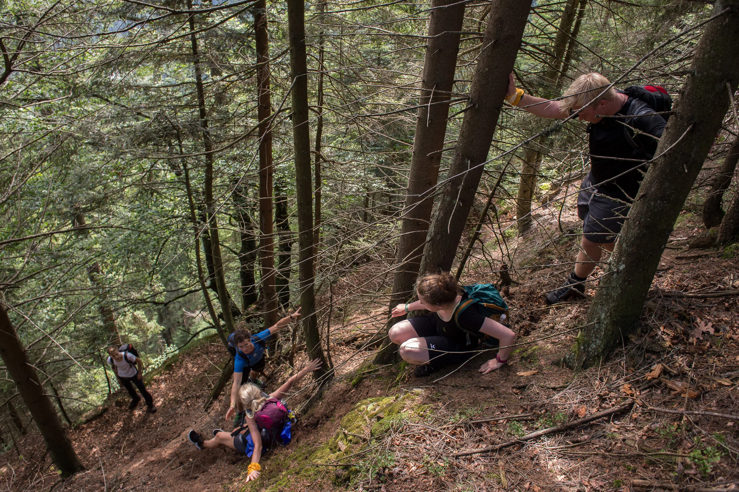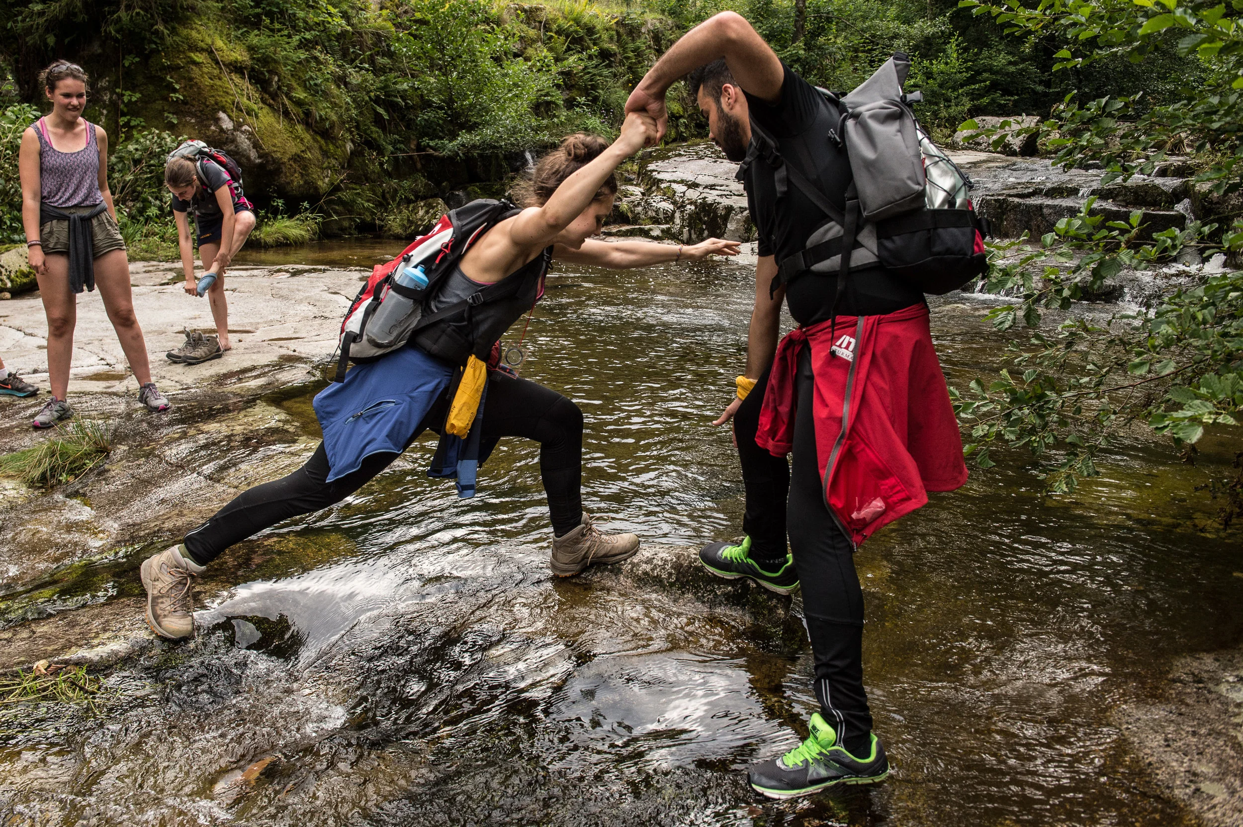 Zuerst mussten wir den Philippenkopf ausfindig machen. Nachdem wir in einem weiteren Rätsel die Nummer des Teufels auf den Kopf gestellt hatten, ging es weiter zum Diebaukopf (auf 999 Höhenmetern). Von dort aus bekamen wir die Challenge mit verbundenen Augen zum Blindsee zu laufen. Vertrauen und Teamarbeit waren dabei unentbehrlich. Das nächste Rätsel führte uns zum Schurmsee. Dort mussten wir vier pantomimische Aufgaben lösen, bevor wir unser nächstes Ziel gesagt bekamen. Auf dem Weg nach Schönmünzach ging es auf einem steilen Weg ins Tal. Dort war der erste Checkpoint. Nach einer kurzen Pause im Park ging es auch schon weiter Richtung Staumauer - Schwarzenbach Talsperre. Nach einer 60-sekündigen Yogaübung auf der Talsperre ging es nach einem Stückchen Schokolade sofort weiter. Team 1 übernahm mit 15 Minuten Vorsprung die Führung, dicht gefolgt von Team 4. Einmal um den Stausee herum und weiter zum Herrenwieser See. Barfüßig liefen wir eine Runde um den See.