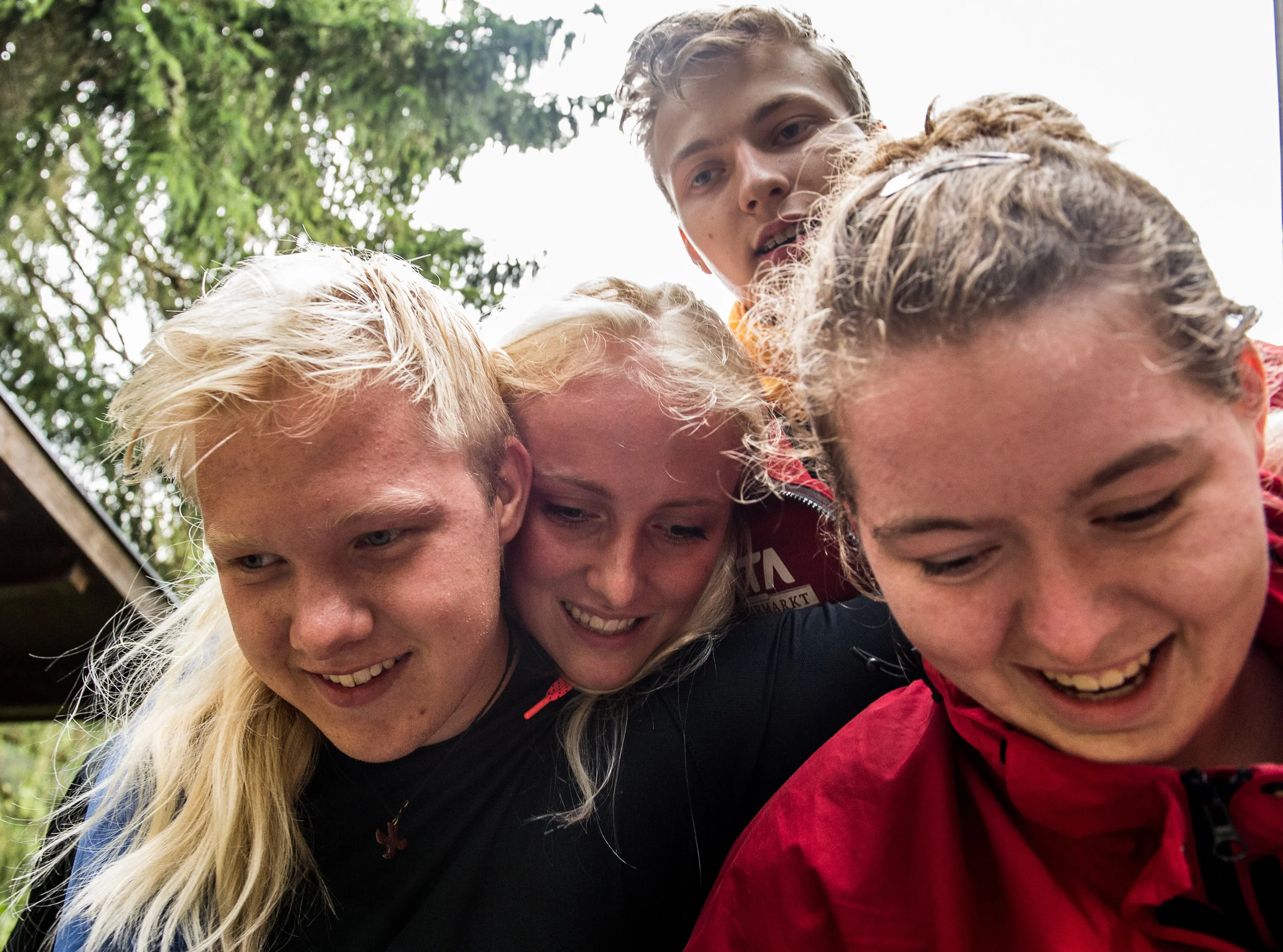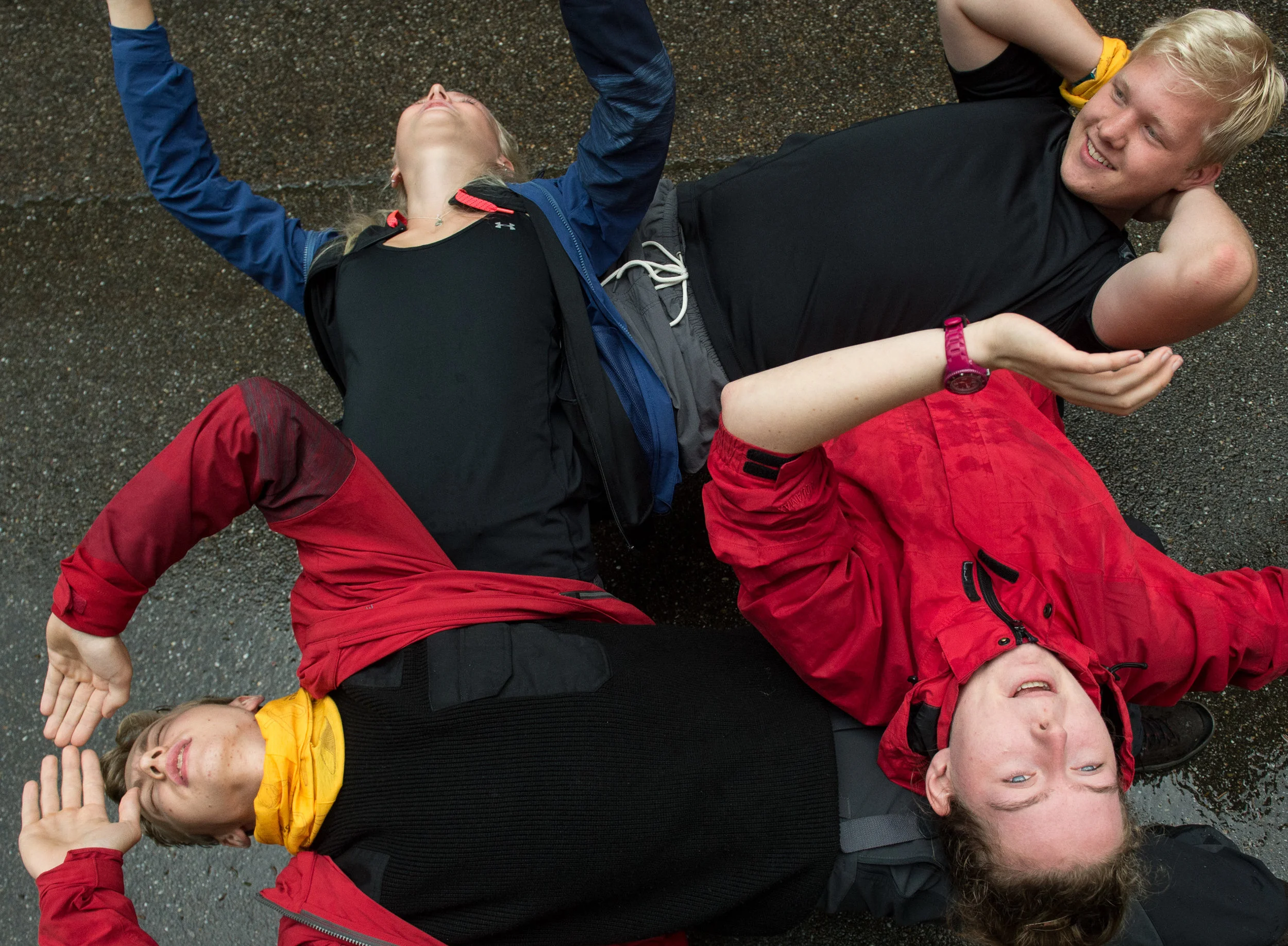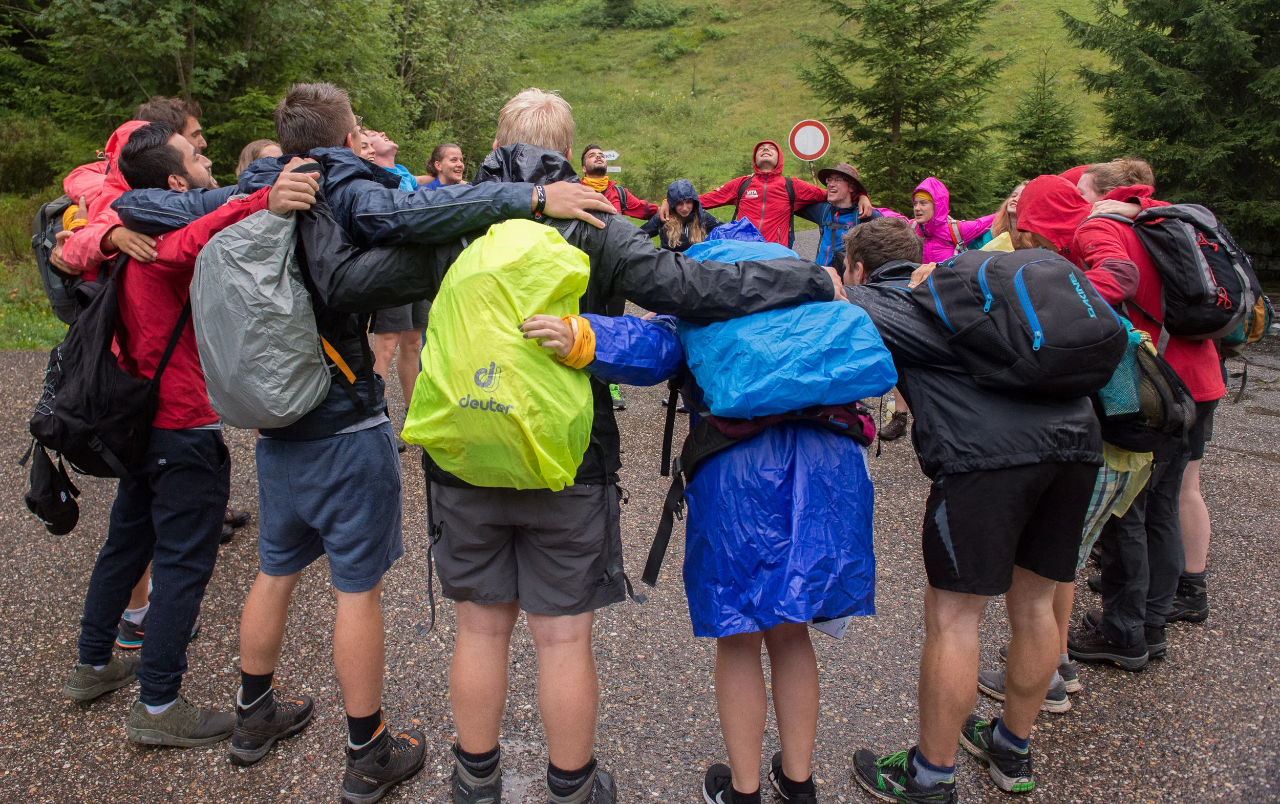 Weiter ging es auf die Badener Höhe. Auf dem Weg dorthin mussten wir für die nächste Challenge Naturmaterial für ein Seil sammeln. Dieses Seil musste vom Turm auf der Badener Höhe von der ersten Etage bis zum Boden reichen. Mittlerweile waren alle ziemlich fertig. Doch trotzdem mussten wir noch zum Naturfreunde Haus gelangen. Unsere letzte Challenge bestand darin, dass immer zwei Füße mit Klebeband zusammen gebunden wurden. Als Team ging es dann den Weg hinunter bis zum Schild „Badener Höhe“. Dort wurden wir vom Klebeband befreit. Nun hieß es Endspurt. Auf dem Weg zur Zielgeraden nahmen alle ihre letzten Kräfte zusammen und rannten durch das Ziel. Team 1 war zuerst im Ziel und empfing dann herzlich Team 4. Weiter bejubelten wir zuerst Team 3 und zu guter letzt Team 2. Egal welchen Platz die einzelnen Teams erreicht hatten, alle konnten sagen, dass sie über ihre Grenze hinausgegangen waren und echt etwas erreicht hatten.